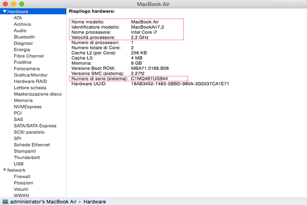 • Se è richiesto l’identificatore del modello (per esempio MacBookAir7,2), cerca questa informazione in “Riepilogo hardware”.